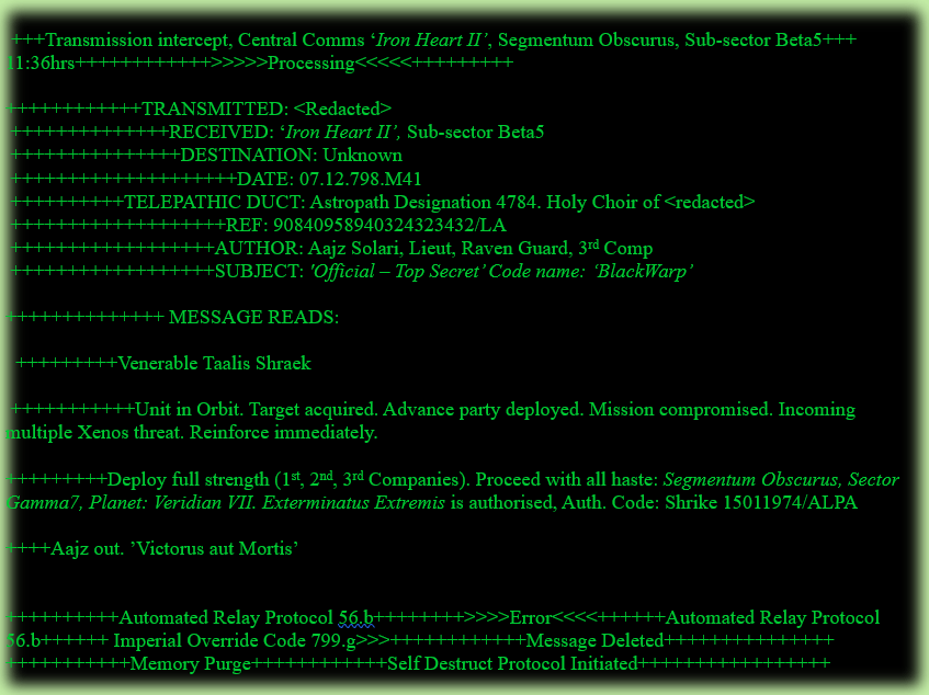 He was troubled though, Veridian VII was far into the Obscurus Segmentum, navigating the immaterium from here, even in short jumps with his most gifted psyker at the helm, was a perilous and lengthy undertaking, it would be long before that message arrived, if indeed it did at all, and even longer before help would come…